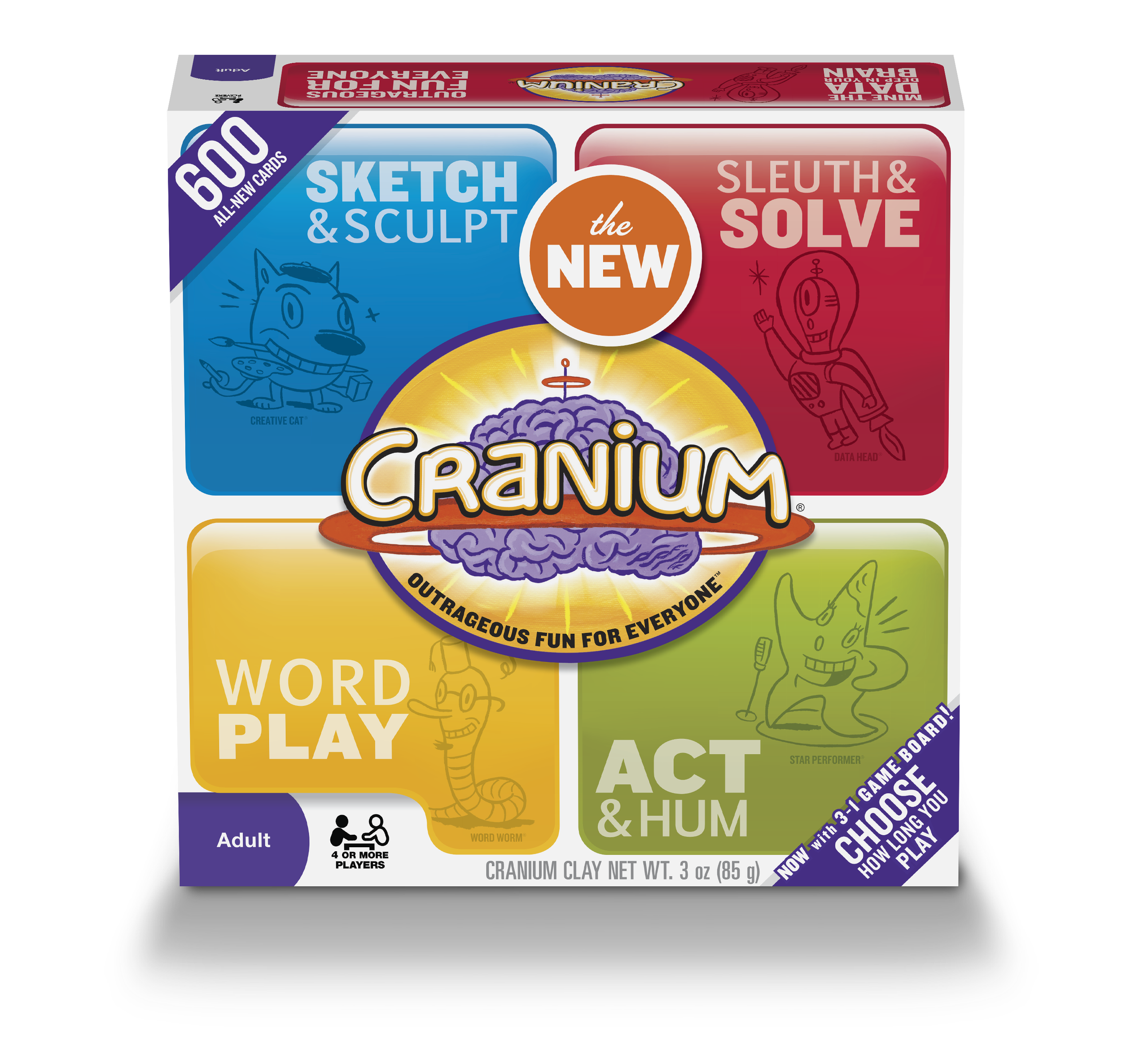 As Designer and Art Director, I developed Cranium Pop 5, an adult pop-culture party game blending humor and creativity. I led the product’s visual and structural design — collaborating with an industrial design firm to shape the packaging’s form and function for both shelf impact and playability. I created a custom dieline featuring a “try-me” window to engage players at retail, and designed the print finish using foil accents, spot UV gloss, and matte textures in the signature Cranium purple palette. The result was a dynamic, tactile package that reflected the brand’s playful personality while standing out in the party game category.